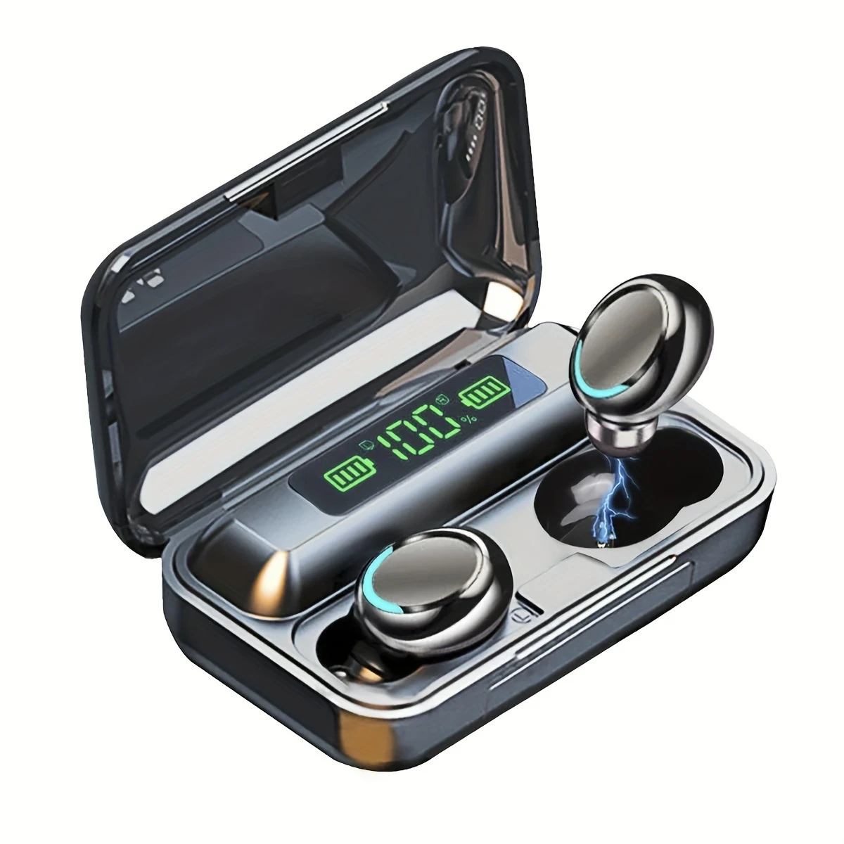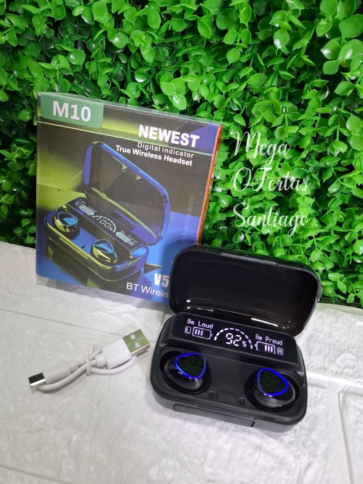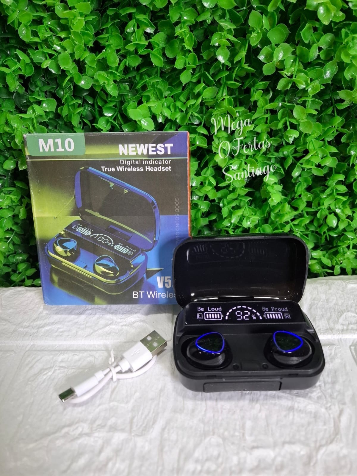 Auriculares Bluetooth 5.1 M10 TWS con pantalla LED que indica la cantidad de batería del estuche y el proceso de carga de los auriculares.