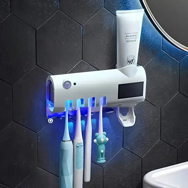 3. Diseño multifuncional que combina dispensador de pasta dental, soporte para cepillos y esterilizador.