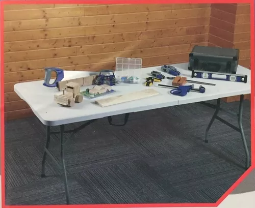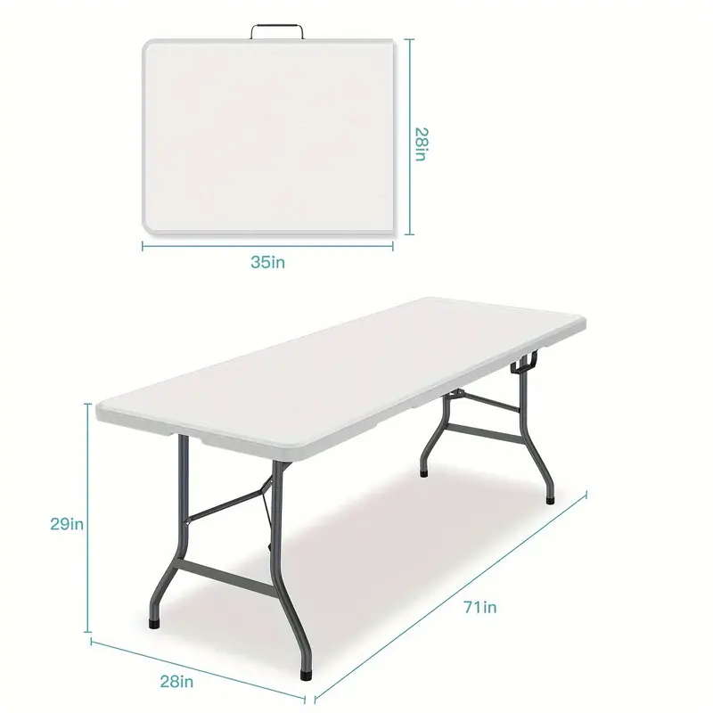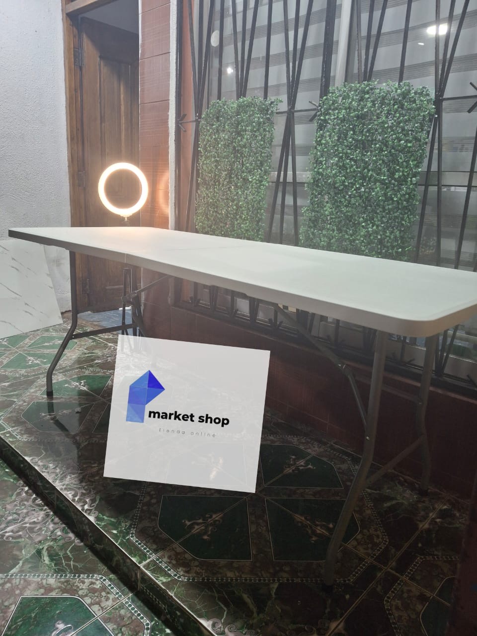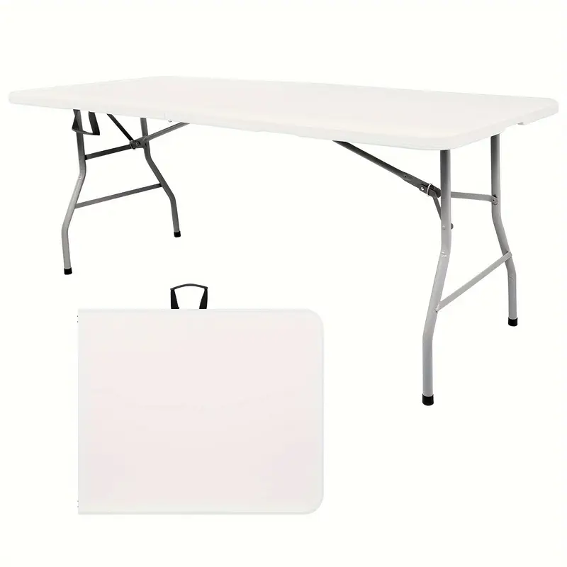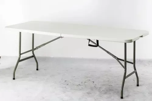 Esta es una mesa plegable de PVC, resistente y liviana, fácil de transportar y que no ocupa espacio. Es perfecta para jardín, patio, balcón, quincho o campamento.